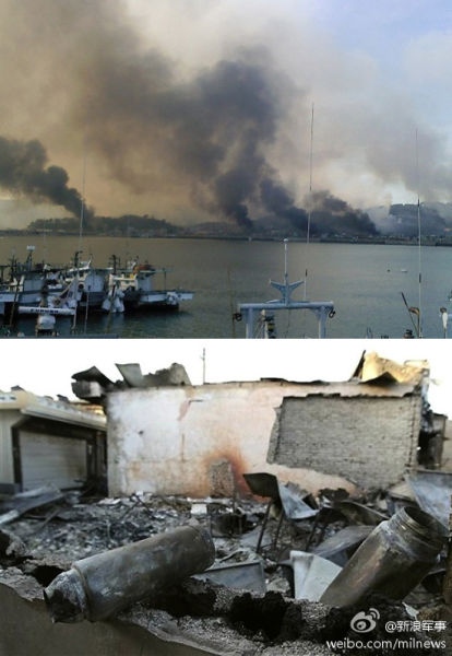 • 资料图:2010年延坪岛炮击事件中,冒起浓烟的韩国建筑。