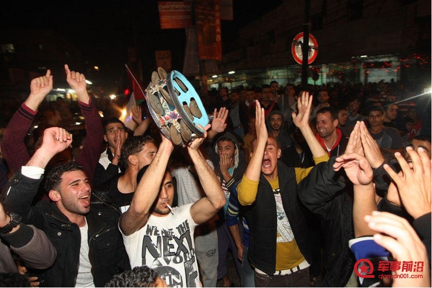 当地时间2012年11月21日晚上9点,以色列和巴勒斯坦实施停火。 当晚,数万名巴勒斯坦人走上加沙街头,以向空中开枪、跳舞和汽车鸣笛的方式 庆祝巴以停火协议生效,以及持续一周的战争结束。