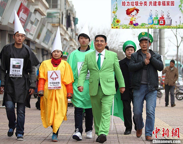 2月21日,11位来自全国各地、自称是污染企业老板的男子聚在江苏黄埔再生资源利用有限公司陈光标的公司内,在一大堆已经燃放后的烟花爆竹废品前戴上象征绿色出行的绿帽子,举起写有“不放烟花、少造点纸、支持正能量、给力垃圾分类”等牌子,用一种近乎行为艺术的方式响应陈光标日前发出的环保号召。图为陈光标(左四)与他们一起走上街头宣传环保。
