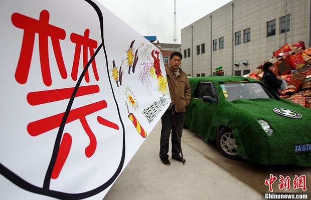 2月21日,11位来自全国各地、自称是污染企业老板的男子聚在江苏黄埔再生资源利用有限公司陈光标的公司内,在一大堆已经燃放后的烟花爆竹废品前戴上象征绿色出行的绿帽子,举起写有“不放烟花、少造点纸、支持正能量、给力垃圾分类”等牌子,用一种近乎行为艺术的方式响应陈光标日前发出的环保号召。图为一位男子拉着写有“禁”字的标语参与活动。