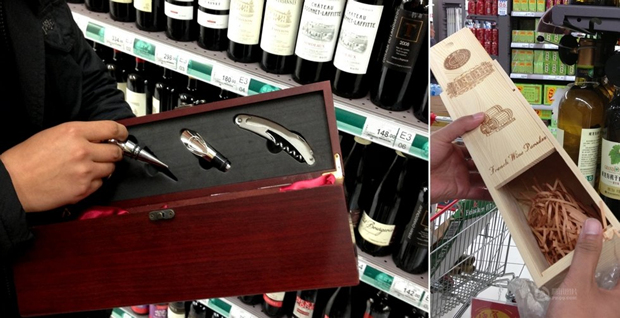 在上海一家超市内,消费者购买200元以上的红酒,卖场赠送杉木盒包装(右);购买600元以上的红酒,卖场赠送的是红木锦盒包装并附有红酒器具(左)(拼版照片,2月21日摄)。