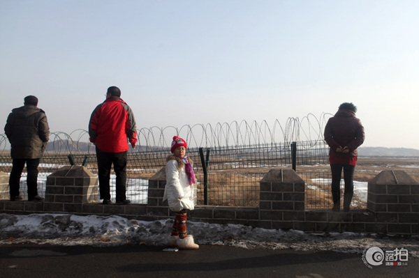2月14日,中朝边境“一步跨”,形容边界线近乎接壤。曾经是走私贩毒和偷渡越境猖獗之处。几名游客在此观望朝鲜。