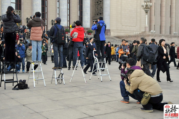 3月3日,北京,在两会现场忙碌的新闻记者。