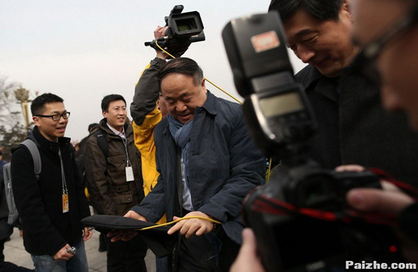 3月2日,北京,摄像机的线缠莫言身上,他一言不发,边走边解开线。