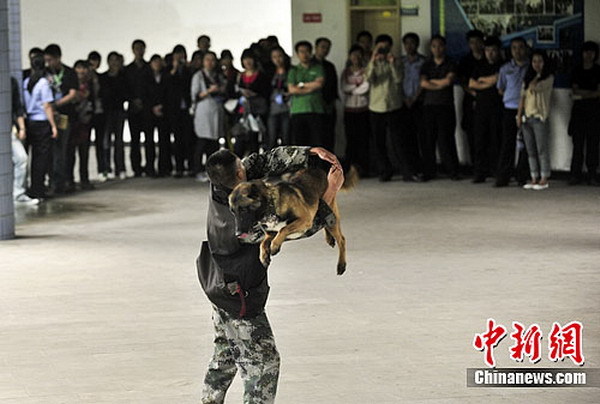5月24日,重庆市公安局警犬基地举行警营开放日活动,众多当地市民走进警犬基地与警犬亲密接触。图为刑侦犬“皮球”做跳跃钻圈训练表演。警方供图重庆市公安局警犬基地隶属于重庆市公安局刑警总队,于2009年被公安部认证为二级警犬繁育基地,负责该市警犬繁育、业务培训、警犬复训、犬病防治和业务管理等工作。新警犬基地拥有五个品种的警犬44头,带犬民警11人, 现役工作犬9头。