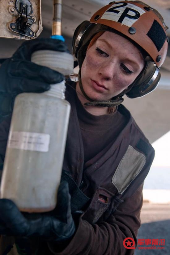 当地时间2012年1月3日,航空机械兵飞行员Samantha Phillips从F/A-18E超级大黄蜂上收集燃料样品。