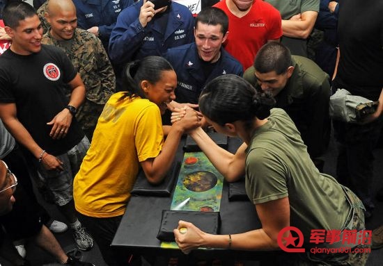 当地时间2011年12月11日,水兵Denise Williams和Marine Sgt. Amanda Joseph比赛扳手腕。这种比赛是他们在海上生活的一种休闲活动。